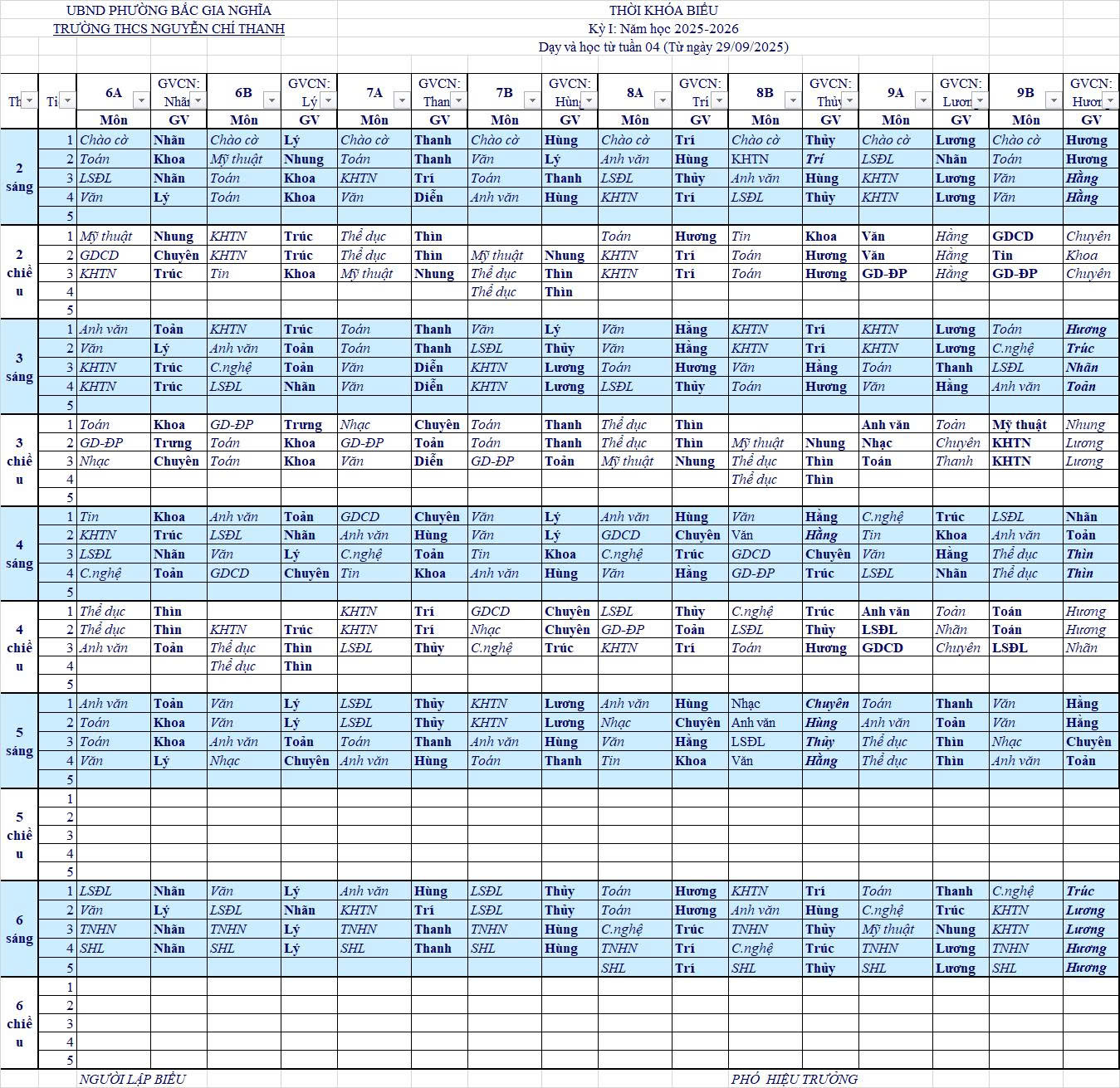 THỜI KHÓA BIỂU TUẦN 4 NĂM HỌC 2025-2026